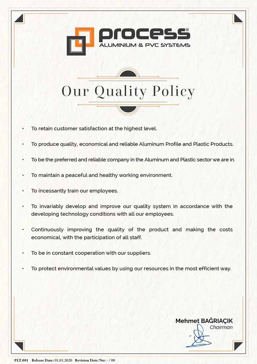 To invariably develop and improve our quality system in accordance with the developing technology conditions with all our employees.